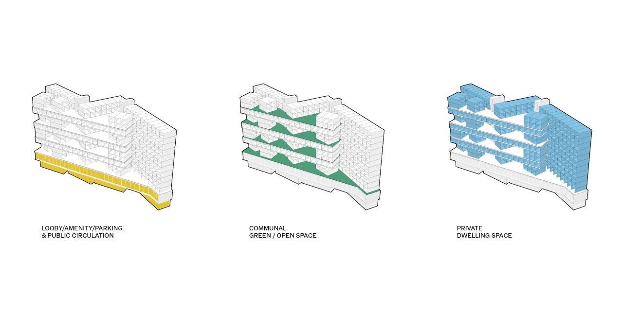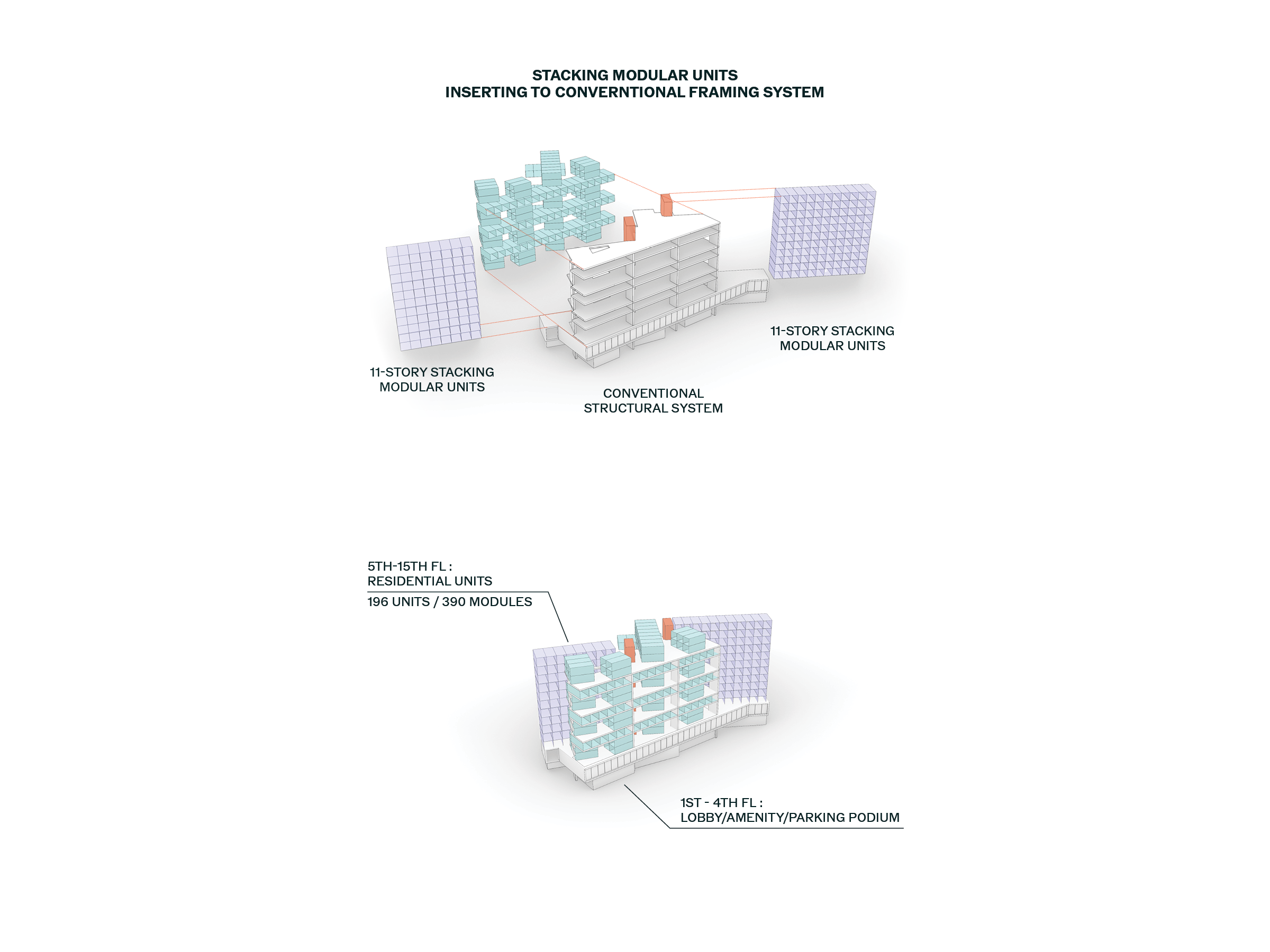 Conceived as an entry in an Affordable Housing competition, the project proposes 196 residential units organized across 360 prefabricated modules. Unit types range from one to three bedrooms, offering floor plans between 600 and 1,200 square feet. The design concept utilizes a conventional structural frame to support standardized pre-fabricated modular construction. Each module is composed of repeatable components for living, sleeping, and service spaces, allowing for variation in layout while maintaining consistency in fabrication. The modular strategy enables efficient and flexible stacking parameters while optimizing efficiencies in transport, spatial adaptability, and construction speed. A four-story podium houses parking, the main lobby, and resident amenities, creating a base that engages street access and supports the residential mass above.