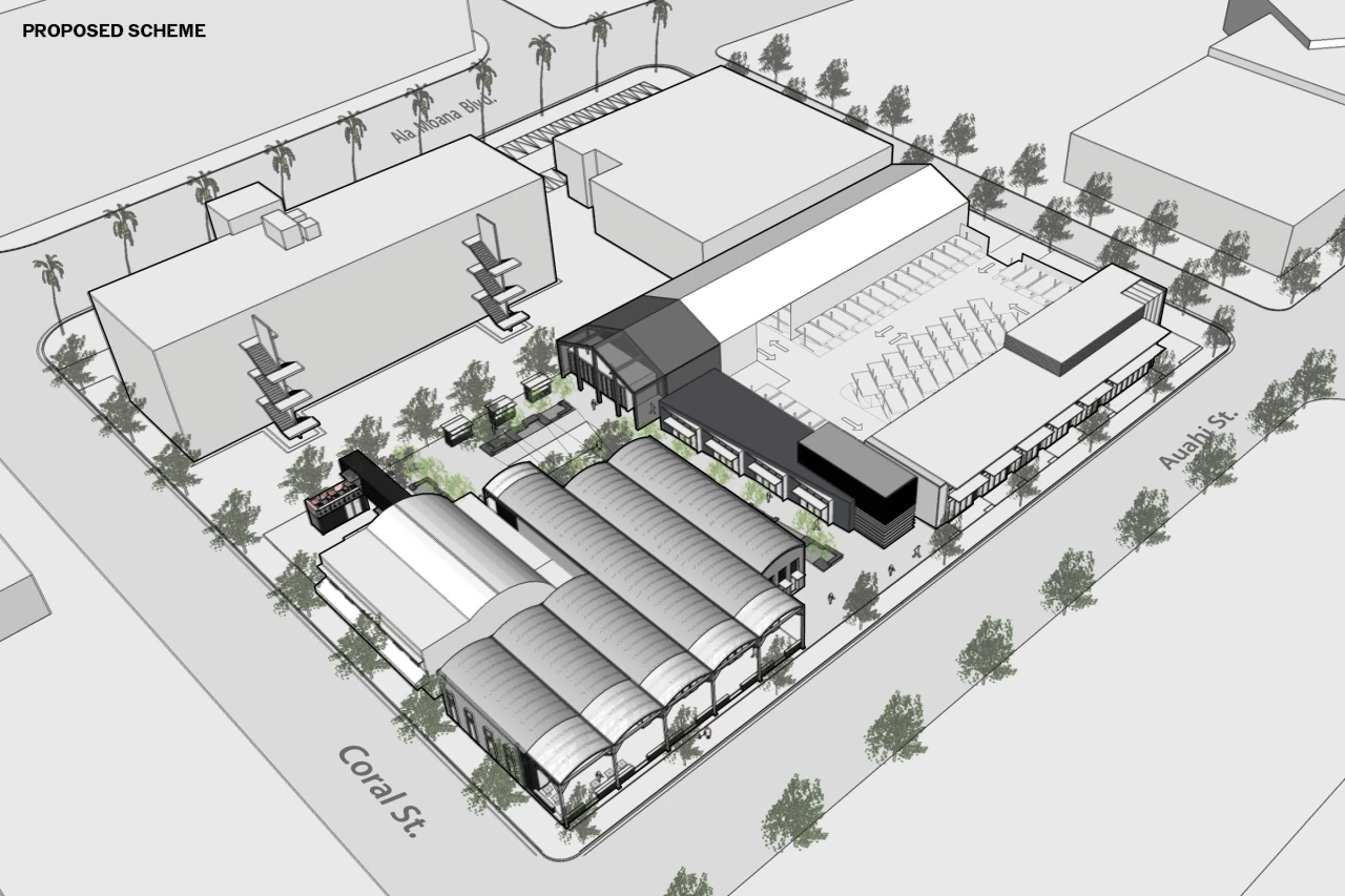 Rather than erasing the site’s industrial past, the project builds upon it—repositioning four existing structures into a pedestrian-oriented framework of public space, small-scale commerce, and cultural programming that supports everyday life. A mid-block crossing, open-air courtyards, and shaded gathering spaces activate surfaces once reserved for service and parking, while material choices such as reclaimed local wood, corrugated metal, and weathered steel preserve a familiar industrial character. By prioritizing local entrepreneurs, artists, and community programming over national tenants, SALT establishes itself as a cultural and civic anchor, demonstrating how adaptive reuse can extend the legacy of place while shaping a new urban identity for Kakaʻako.